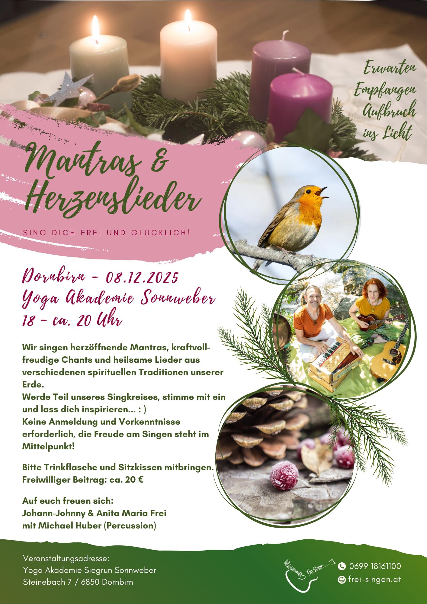 Sende mir gerne eine Nachricht per Email: siegrun@yoga-fitforlife.at oder per Handy: 0699/11947248